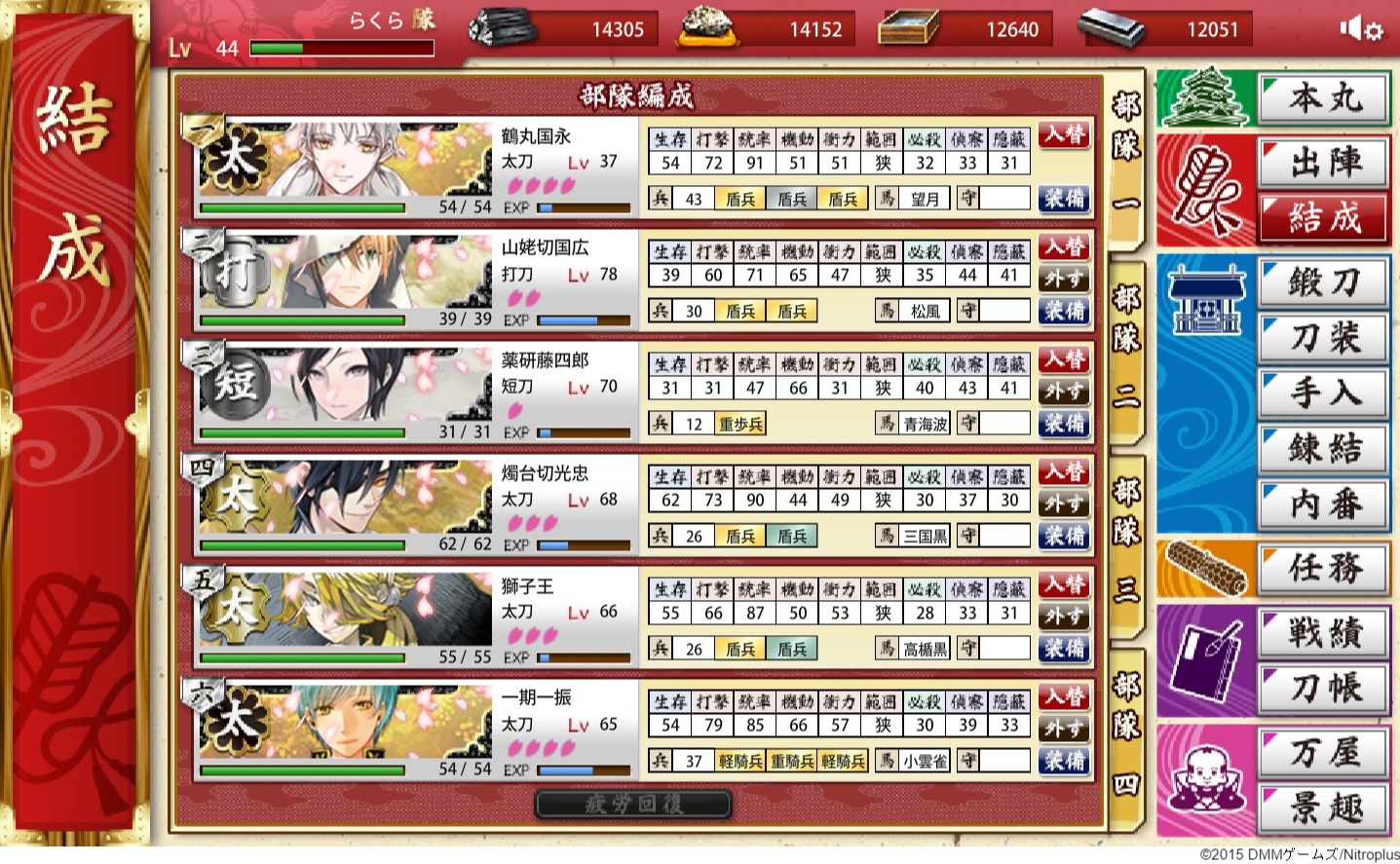 テンション上がったイケメンがそこそこに脱げて強くなるゲームの話 刀剣乱舞やってます。始める前までの仕事による陰鬱な気持ちがなくなるには結構ハマってます。 先程5-4をクリアできました!クリアした時の隊員です。いやあ3-1で一週間引っかかってた(マジ)時に比べればE5なんて楽勝ですよ。くぅ~疲れましたw社会人審神者はつらい(言い訳)本当は4-4まで誉ハンターだった薬研兄貴やよく剥げる堀川君もいたのですが、5-1からはお休みしていてもらいました。二人ともレベル30代だったので、ちょっと短刀と脇差にE5はきついかなと思って。レベリングして剥げなくなったら彼らも5-4おじいちゃん探索メンバーに加わってもらいたいです。これからはイベント始まるまではいない刀を迎えに行ったりのんびりやりたいなと思っています。あとはケッコン的なのが出来ると踏んで、カンスト近くまでレベリングって感じですかね。さぁ明日も仕事だ!しかもしばらく5連勤!!有給でも取ろうかな!!社畜は寝ます!おやすみ!!